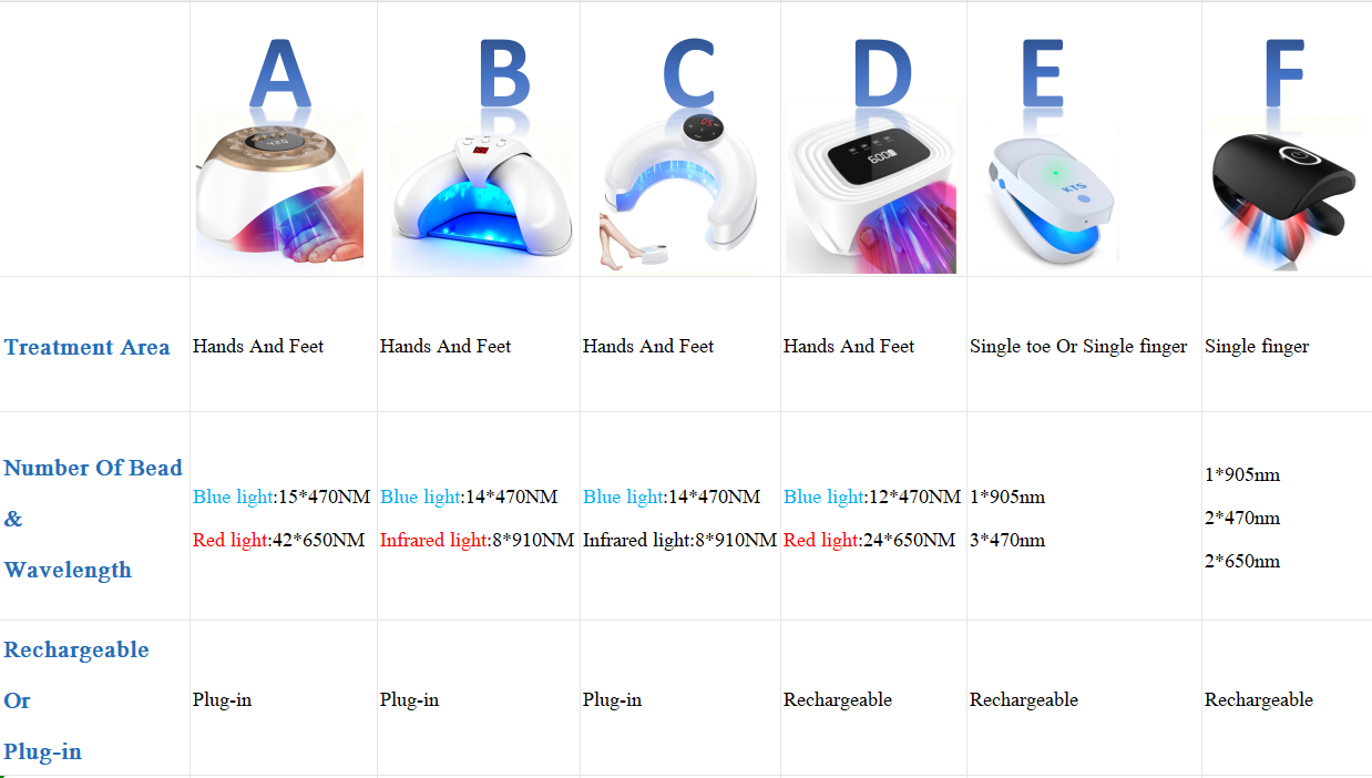 Most of our devices are composed of 470nm blue light and 650nm red light.The combination of blue and red light is highly effective in treating nail fungus.