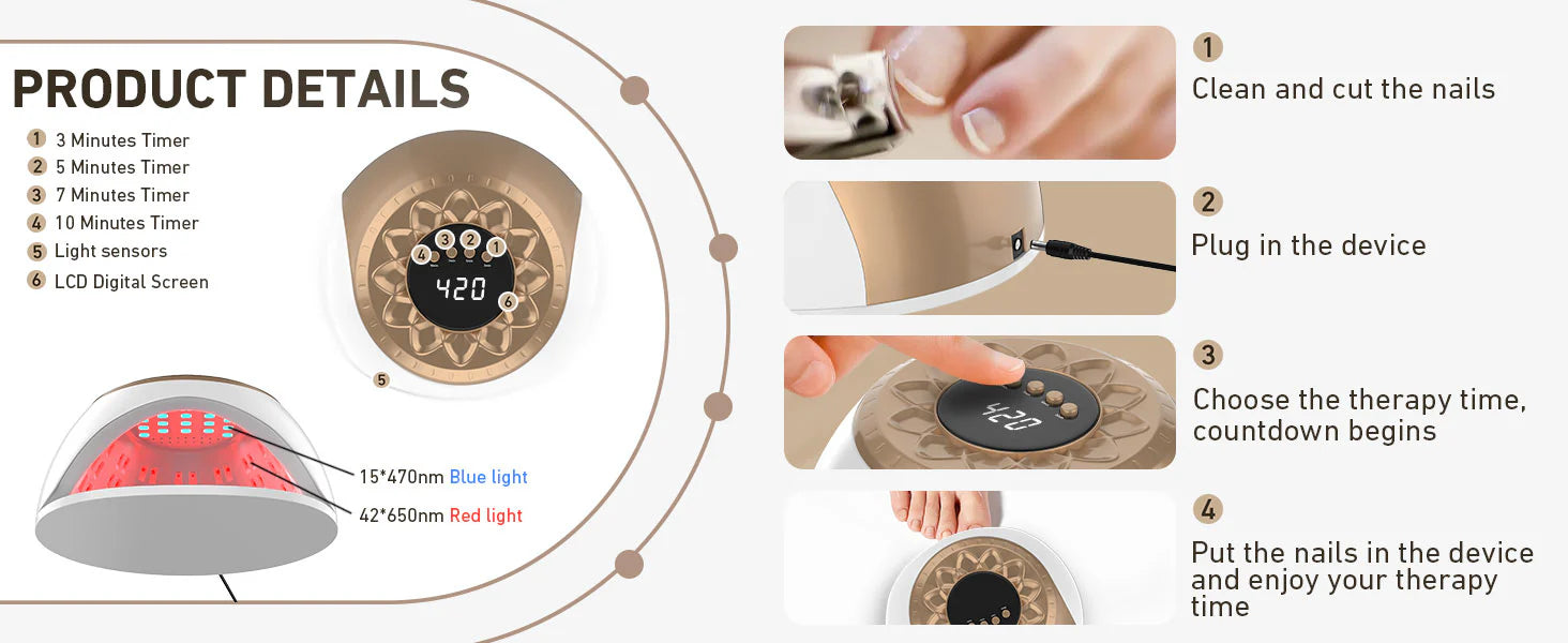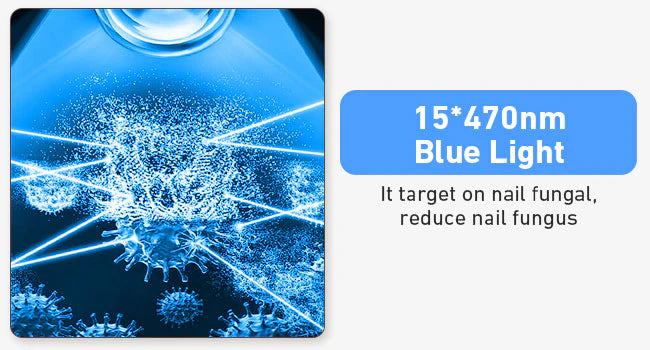 The 470nm blue light targets the fungus by penetrating the nail surface and effectively neutralizing the infection, while the 650nm red light promotes circulation and healing by stimulating tissue regeneration. This dual-light therapy works synergistically to enhance treatment results.