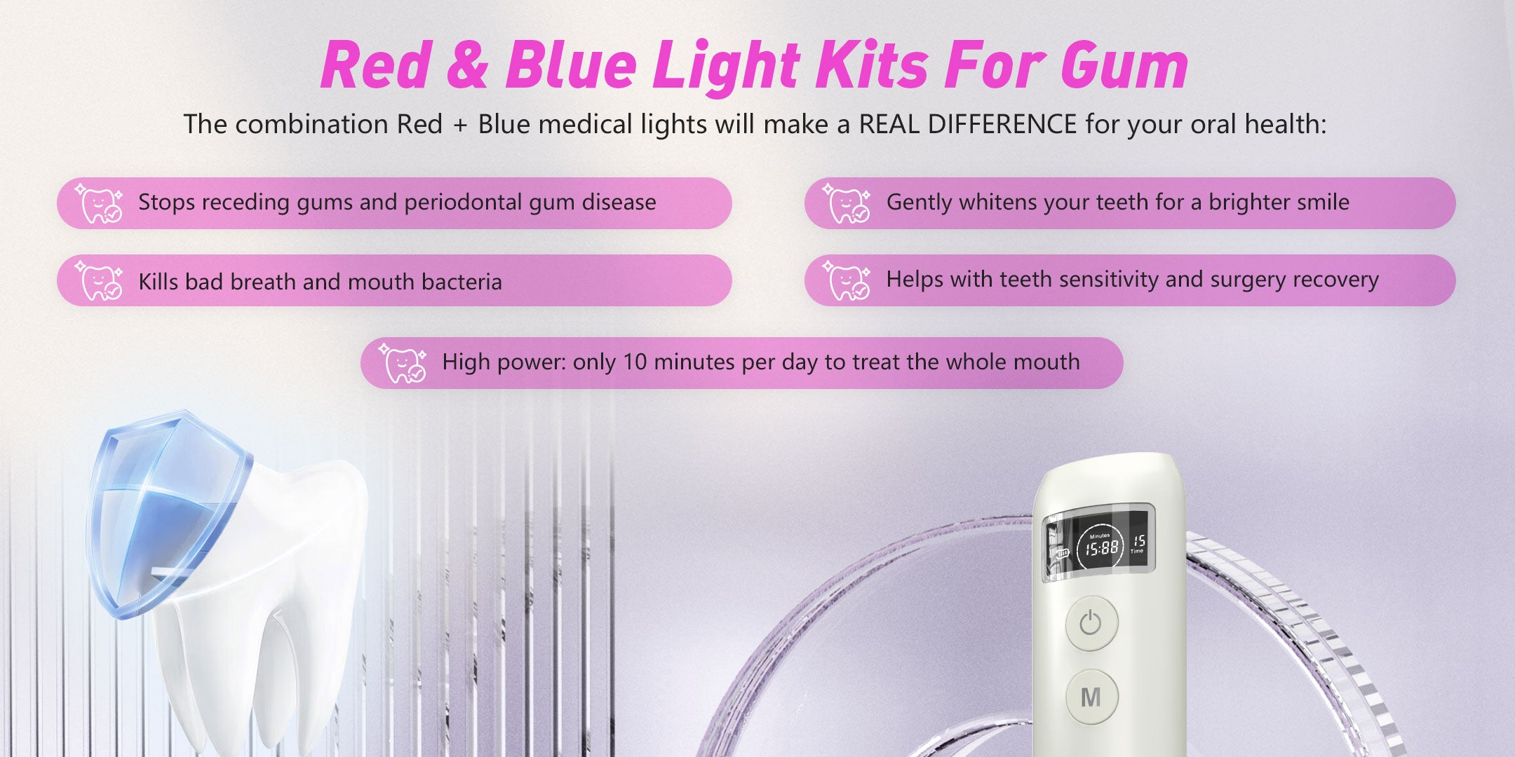 • Upgraded Gum Care for 2024: Utilizing advanced red and blue light technology, this device penetrates teeth and gums to improve blood circulation, promote tissue healing, and reduce inflammation. Blue light therapy offers antibacterial properties, enhancing gum health by boosting tissue repair and controlling harmful bacteria in periodontal disease. It effectively addresses issues such as periodontitis, gum recession, gum bleeding, post-surgery pain, gum and tooth sensitivity, bad breath, and teeth whitening, delivering faster recovery and pain relief.