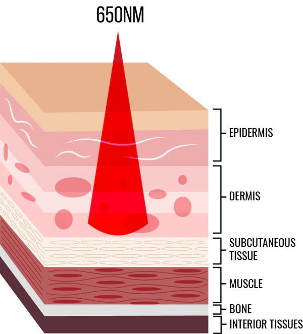 Red light penetrates the skin at the surface and muscular tissue levels. It works by getting the cells in the area to reproduce faster. This causes healthy new cells to emerge and replace the old damaged cells. It also increases the flow of nutrient-rich blood in the area which leads to faster cell regeneration.